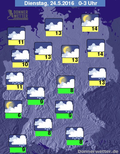 In der zweiten Nachthälfte gibt sich der Himmel über weiten Teilen Deutschlands bedeckt, einzelne Auflockerungen sind vor allem in der Osthälfte möglich. Schauer beschränken sich zunächst noch auf die südlichen und westlichen Bundesländer, in den frühen Morgenstunden des Dienstag weiten sich die Regengebiete dann aber auf das gesamte Bundesgebiet aus.