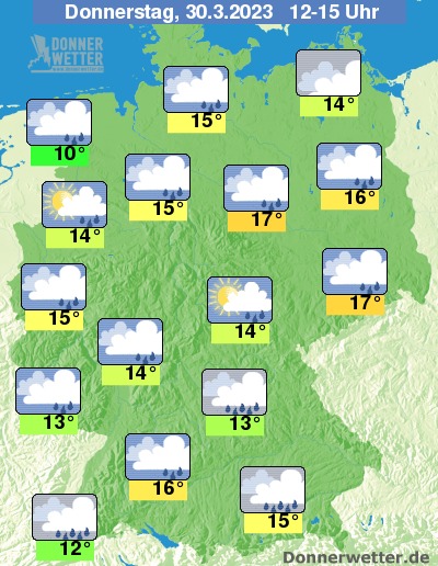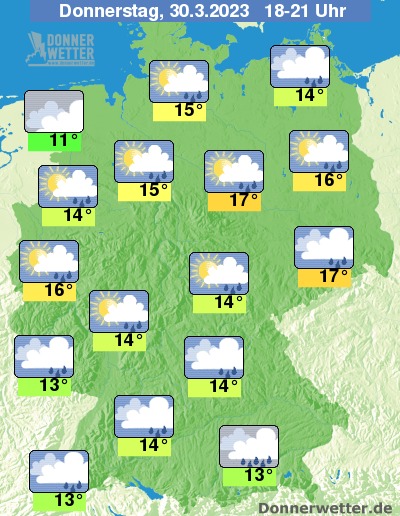 Heute Abend ziehen oft dichte Wolken durch, dazwischen kann es aber vor allem nach Westen hin auch längere Zeit aufheitern. Es bilden sich besonders über der Südosthälfte zeitweise Schauer, örtlich auch Gewitter. Die Temperatur liegt bei 11 Grad in Cuxhaven und 17 Grad in Dresden.