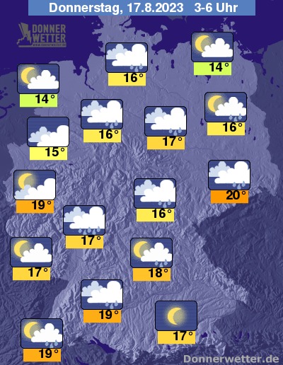 In der Nacht zum Donnerstag ist es im Südosten des Landes noch meist sternenklar, sonst ziehen aber verbreitet viele und auch kompakte Wolken durch und besonders von der Mitte des Landes bis in den Süden bilden sich vielerorts Schauer und nicht selten auch Gewitter. Im Norden und vor allem an der Küste ist der Himmel auch oft locker bewölkt, hier bleibt es meist trocken. Die Temperatur sinkt auf tropische 20 Grad in Dresden und bis 14 Grad in Rostock.