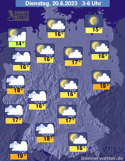 In der kommenden Nacht ist es nach Nordosten hin meist noch gering bis locker bewölkt und meist trocken. Im übrigen Land ziehen von Südwesten her oft viele und dichte Wolken durch und es bilden sich verbreitet Schauer und örtlich auch Gewitter. Die Temperatur sinkt auf 19 Grad in Freiburg und bis 14 Grad in Cuxhaven.