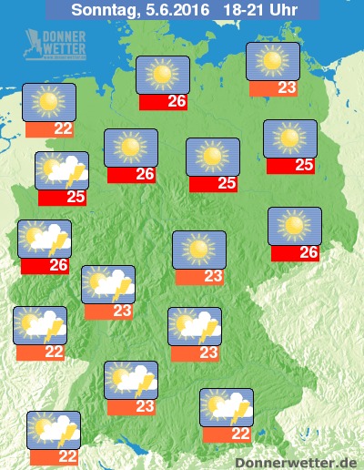 Heute Abend strahlt über dem Norden und Osten verbreitet die Sonne und es bleibt auch weitgehend trocken. Dagegen sorgen schwülwarme Luftmassen nach Südwesten hin noch für oft dichte Wolken und mögliche Schauer und einzelne Gewitter. Hier und da sind auch noch kräftige Gewitter möglich. Das Gewitterpotenzial nimmt jedoch insgesamt langsam ab. Die Temperatur liegt bei 22 Grad im Breisgau und um 26 Grad in Hannover.