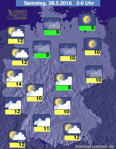 In der bevorstehenden Nacht bleibt der Himmel über dem Norden und Osten oft sternenklar und sonst meist nur locker bewölkt. Im Westen und Süden ist es größtenteils aufgelockert und nur zum Teil auch stark bewölkt, vor allem im Südwesten der Republik halten sich jedoch oft dichte Wolken, dabei sind vereinzelte Schauer und Gewitter nicht auszuschließen. Am Niederrhein sind ebenfalls einzelne Schauer und Gewitter möglich. Im großen Rest des Landes bleibt es hingegen weitgehend trocken. Die Temperatur sinkt auf 14 Grad in Aachen und etwa 8 Grad im Eichsfeld.