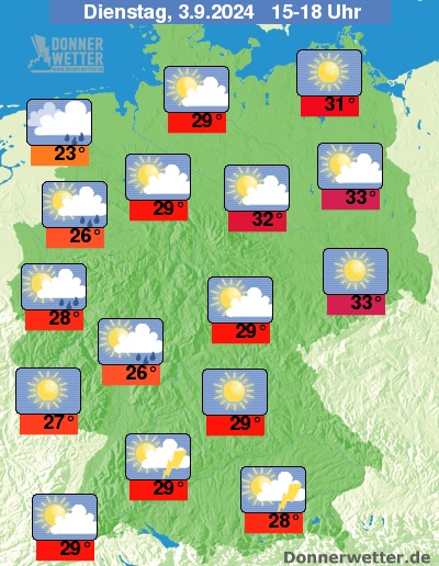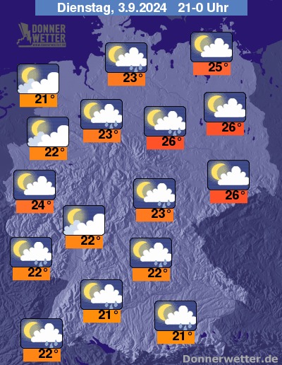 Am Dienstagnachmittag zeigt sich der Himmel über weiten Landesteilen wechselnd bewölkt und vor allem im Umfeld der Mittelgebirge muss zeitweise mit kräftigen Schauern und Gewittern gerechnet werden. Im Westen und Nordwesten lockert es in Richtung Abend auf und es sind nur noch selten Schauer und Gewitter möglich. Trocken und meist sonnig bleibt es am Nachmittag in der Nordost- und Osthälfte.