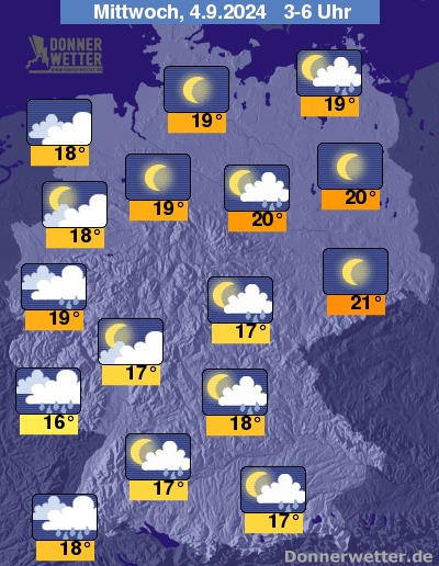 In der Nacht zum Mittwoch sind zunächst in Alpennähe weitere Gewitter möglich. Von Südwesten ziehen zudem neue Gewitter auf, die im Nachtverlauf nordwärts vorankommen. Entlang der Oder bleibt es bei geringer Bewölkung oder klarem Himmel weitgehend trocken.