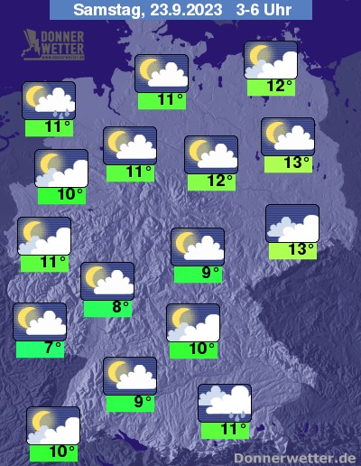 In der kommenden Nacht ziehen im Nordwesten oft kompakte Wolken durch und hier können sich sowohl Schauer als auch örtliche Gewitter entwickeln. im Alpenvorland fällt aus dichten Wolken oft leichter Regen. Im übrigen Land ist es teils stark, zunehmend aber auch locker bewölkt, dazu bleibt es weitgehend trocken. Die Temperatur sinkt auf 13 Grad in Berlin und bis 7 Grad in Saarbrücken.