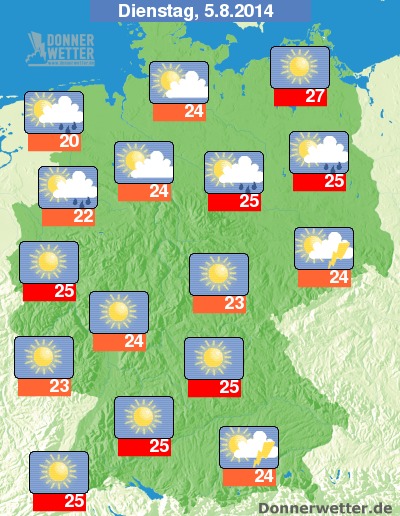 Heute können wir verbreitet wieder mit viel Sonnenschein rechnen, dabei sind jedoch vor allem im Norden und in Alpennähe und insbesondere am Nachmittag einzelne Schauer und Gewitter möglich, sonst bleibt es weitgehend trocken. Die Temperatur steigt auf 20 Grad an der nördlichen Ems und bis 27 Grad an der Müritz.