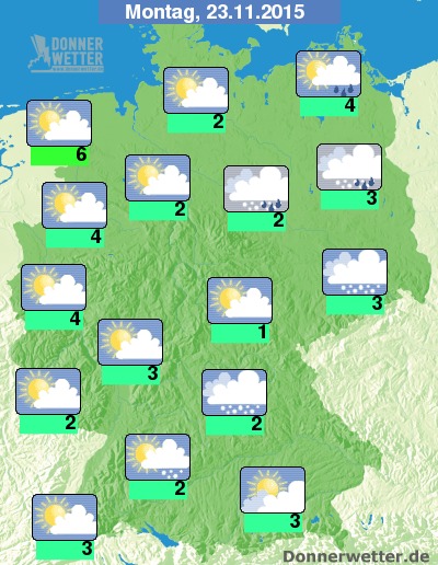 Heute zeigt sich über dem Norden und Westen verbreitet die Sonne und es ziehen hier meist nur lockere Wolken durch, dazu bleibt es auch trocken. Oft stark oder dicht bewölkt bleibt es hingegen über der Südosthälfte des Landes, hier fällt auch zeitweise Regen, Schneeregen oder Schnee mit entsprechenden Glättegefahren. Auflockerungen sind hier jedoch ebenfalls möglich. Die Temperatur steigt auf kalte 1 Grad im Leipziger Land und bis etwa 6 Grad in Emden.