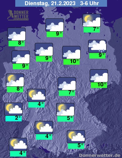 In der kommenden Nacht bleibt es über der Nordhälfte des Landes bedeckt, die gebietsweisen Regenfälle lassen zum Morgen hin jedoch deutlich nach, so dass dann nur noch mit wenigen Tropfen gerechnet werden muss. Im Süden bleibt der Himmel meist locker bis aufgelockert bewölkt und dazu trocken. Die Temperatur sinkt auf 10 Grad in Dresden und 2 Grad in Saarbrücken.