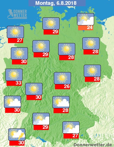 Am Montag ist es größtenteils sonnig und trocken. Im Nordosten und im Süden ziehen jedoch auch immer wieder, zum Teil dichte Wolken durch. Mit Ausnahme der Regionen um den Schwarzwald bleibt es aber trocken. Die Temperatur steigt auf 24 Grad auf Rügen und bis 33 Grad in Köln.