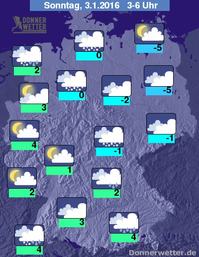 In der Nacht zum Sonntag erstreckt sich ein breites Schneefallgebiet von der Nordsee südostwärts bis zum Bayerischen Wald, hier besteht vielerorts Glättegefahr! Teils ist auch gefrierender Regen möglich! Auch in den übrigen Regionen ist es meist stark bewölkt, jedoch überwiegend trocken. Im Nordosten und Westen lockert die Bewölkung auch verbreitet auf. Die Temperatur sinkt auf 4 Grad in Köln und bis -5 Grad in Neubrandenburg. Der Wind weht im Norden teilweise stark, an den Küsten und auch den Bergen stürmisch, an der Nordsee herrscht zum Teil Sturm.