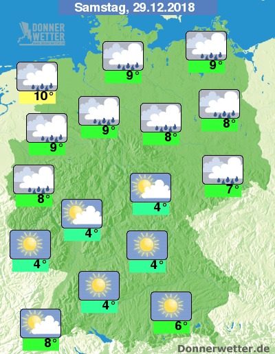Der Samstag spaltet sich ein wenig, denn während im Norden der Regen dominiert, zeigt sich im Süden die Sonne. Die Temperaturen klettern auf 10 Grad C im Ostfriesland und 6 Grad C in Oberbayern.