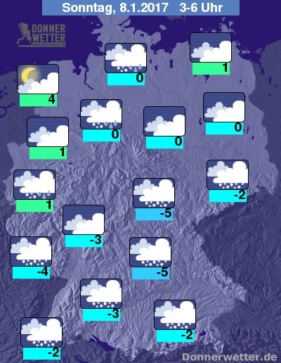 In der folgenden Nacht breiten sich die Schneefälle auch auf den Süden des Landes hin aus, zum Teil schneit es auch langanhaltend, dabei besteht verbreitet Glättegefahr! Im Norden bleibt es noch meist stark bewölkt, jedoch klingen die Niederschläge nach und nach meist ab und im Nordseeumfeld lockert es auch auf. Im Westen und Süden fällt Schneeregen und Eisregen. Erst ab Sonntagmittag entspannt sich die Lage.