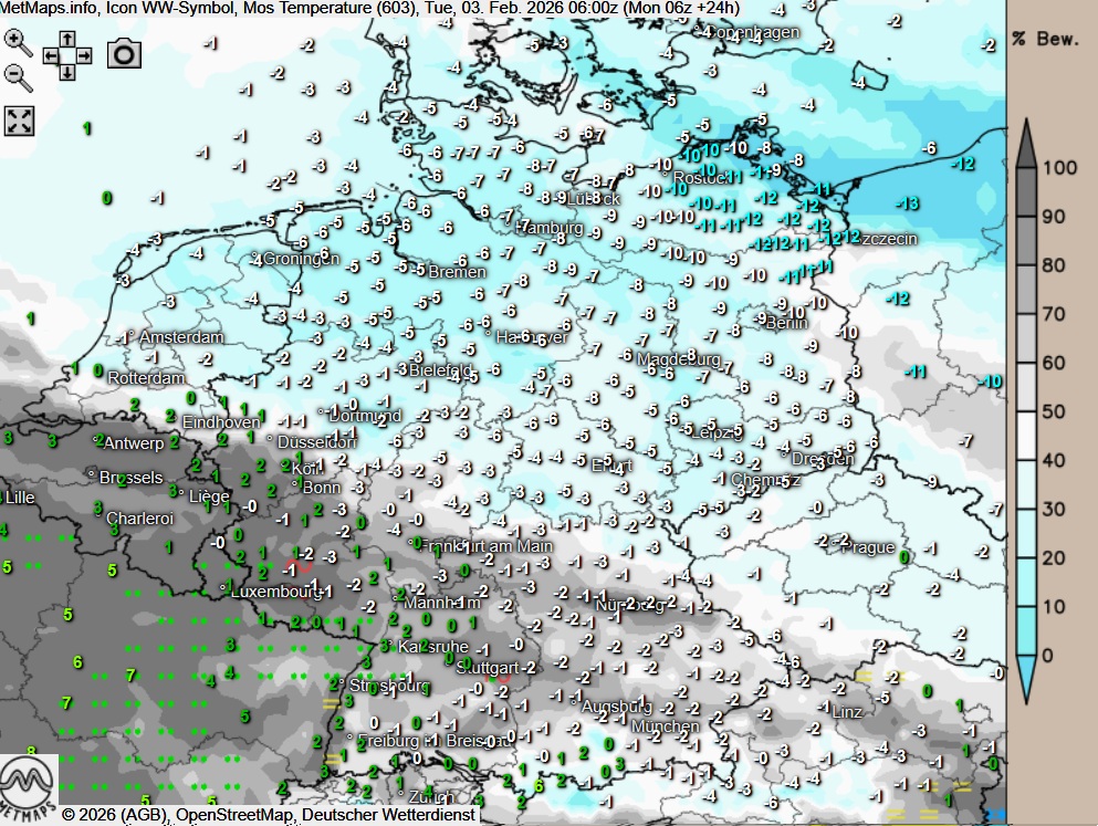 Die Wetter- und Temperaturkarte für Dienstagfrüh (06:00 Uhr) sowie die 24-Stunden-Schneemengen nach ICON: