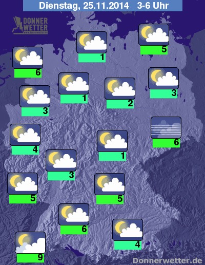 In der folgenden Nacht zeigt sich am Himmel überwiegend lockere bis aufgelockerte Bewölkung. Zeitweise dichte Wolken ziehen jedoch im Südwesten der Republik durch, hier kann es vereinzelt etwas tröpfeln, sonst bleibt es aber trocken. Es bildet sich regional Nebel oder Hochnebel. Die Tiefstwerte liegen bei teils 9 Grad im Breisgau und etwa 1 Grad im Thüringer Becken, dabei besteht Gefahr durch mögliche Reifglätte.