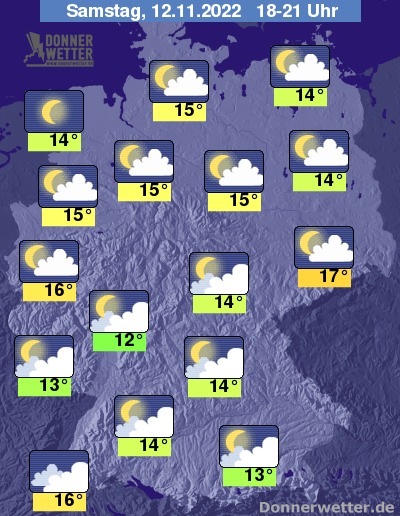 Heute Abend bleibt es über der Nordhälfte der Republik meist locker bewölkt. Im übrigen Land ziehen dagegen mehr und mehr Wolken auf und zum Teil wird es dann auch bedeckt sein. Es bleibt jedoch überall trocken bei Werten von 12 Grad in Wiesbaden und etwa 17 Grad in Dresden.