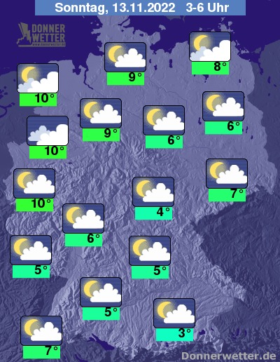 In der Nacht zum Sonntag zieht häufig lockere Bewölkung übers Land hinweg. Vor allem vom Niederrhein bis zur Nordsee und im Ostseeumfeld halten sich auch gebietsweise dichte Wolken. Es bleibt trocken bei Tiefstwerten von 10 Grad am Niederrhein und etwa 4 Grad im Vogtland.