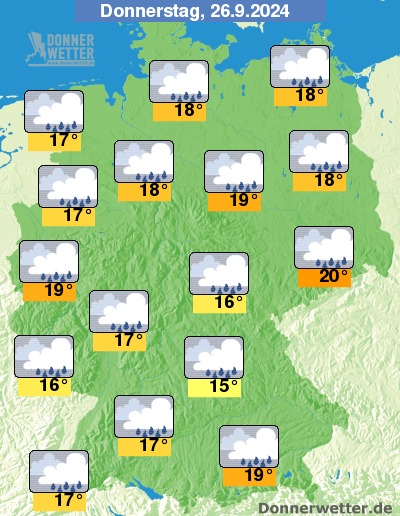 Regenreicher Donnerstag, Temperaturen um 15 bis 20 Grad.