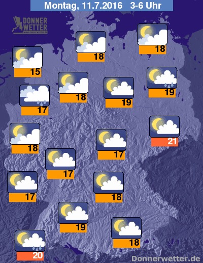 In der Nacht zum Montag sind im Nordosten und Osten anfangs hier und da noch Schauer und vereinzelt auch Gewitter unterwegs, sonst zeigt sich der Himmel überwiegend locker, vor allem im Nordwesten und Südwesten auch teils stark bewölkt. Dazu bleibt es weitgehend trocken. Die Temperatur sinkt auf 21 Grad in Dresden und bis 15 Grad an der Wesermündung.