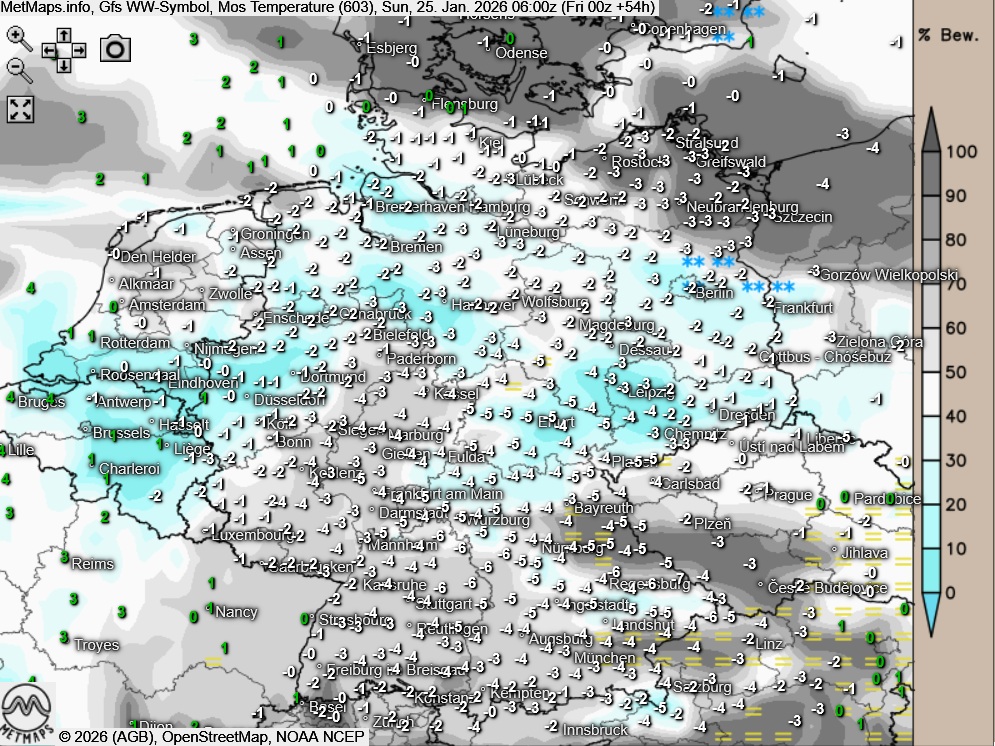 Die Temperatur- / Wetterkarte für Sonntagfrüh sowie die 24-Stunden-Schneemengen bis Montagabend nach GFS:
