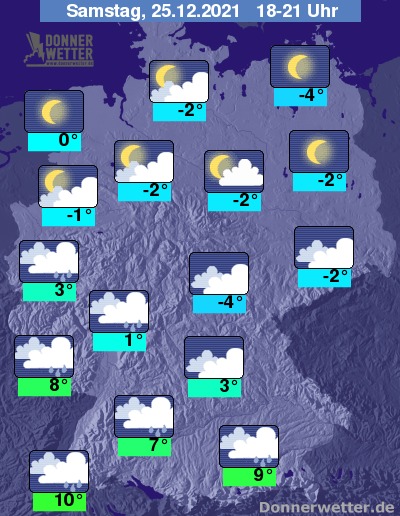 Heute Abend ist der Himmel über Norddeutschland meist sternenklar oder locker bewölkt, dazu bleibt es trocken. Im übrigen Land bleibt die Wolkendecke weitgehend verschlossen und es fällt gebietsweise Schnee, Schneeregen oder Regen. Im Süden fällt weitgehend Regen. Die Temperatur liegt bei -4 Grad in Stralsund und bis 10 Grad in Freiburg.