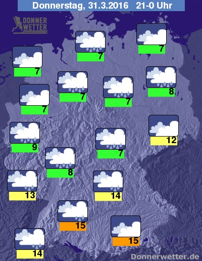 Heute Abend bleibt es verbreitet bei einer geschlossenen Wolkendecke, dabei bleibt es im Alpenvorland sowie im Küstenumfeld weitgehend trocken, sonst fällt jedoch zeitweise, über der breiten Mitte des Landes auch langanhaltender Regen. Die Abendtemperatur liegt bei 15 Grad in München und um 7 Grad an der Elbe.