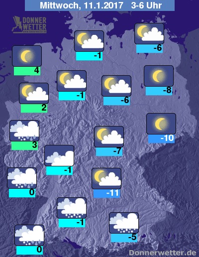 In der bevorstehenden Nacht halten sich nach Südwesten hin dichte Wolken aus denen Schnee, Schneeregen oder auch teils Regen fällt, dabei besteht Glättegefahr! Weiter nach Nordosten hin ist der Himmel meist nur locker bewölkt, vor allem im Osten auch sternenklar, dazu bleibt es trocken. Die Temperatur sinkt auf 4 Grad in Emden und bis auf -11 Grad in Mittelfranken.