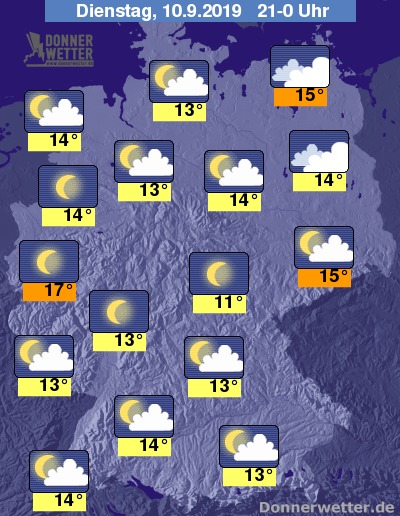 Am Abend lässt der Regen an der Ostsee immer mehr nach, die Wolkendecke bleibt jedoch häufig geschlossen. Im übrigen Land kann man die untergehende Sonne im Wechsel mit lockeren Wolkenfeldern noch genießen.