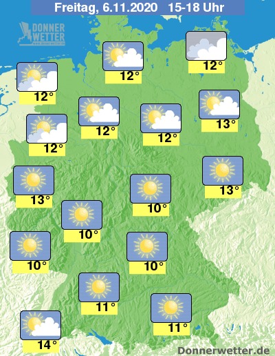 Am frühen Nachmittag ziehen über den Norden teilweise dichtere Wolken hinweg. Sonst scheint abgesehen von regionalen Nebelfeldern oder tiefhängender Bewölkung für längere Zeit die Sonne.