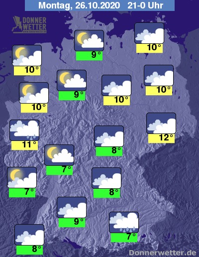 Die Temperaturen liegen am Abend bei Werten um 10 bis 15 Grad, später auf 12 bis 7 Grad fallend.