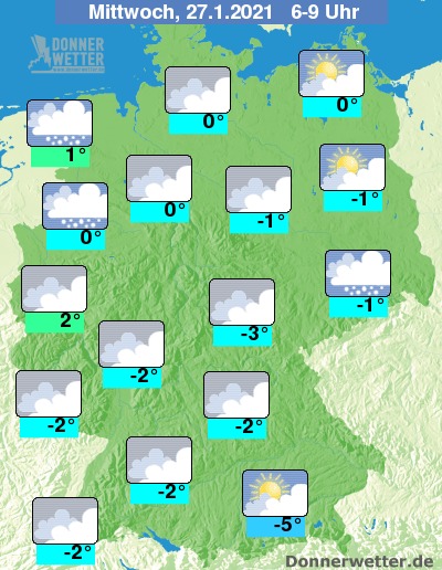 Die Wochenmitte startet in weiten Landesteilen mit einer geschlossenen Wolkendecke, gebietsweise Auflockerungen beschränken sich in der Frühstunden auf den Nordosten der Republik. Im Nordwesten sowie den südostlichen Mittelgebirgen kann es am Morgen etwas schneien oder schneeregnen, sonst bleibt es meist trocken.
