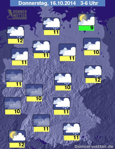 In der Nacht zum Donnerstag breiten sich die dichten Regenwolken noch weiter nach Nordosten hin aus, sie erreichen bis zum Morgen etwa einen Streifen von Niedersachsen bis nach Sachsen, nordöstlich davon bleibt es meist aufgelockert oder nur locker bewölkt und trocken, jedoch kann sich örtlich Nebel oder Dunst bilden. Im Südwesten des Landes klingt der Regen in der zweiten Nachthälfte nach und nach ab und die Bewölkung lockert gegen Morgen verbreitet auf, dann ist hier ebenfalls regional mit Nebel oder Dunst zu rechnen. Die Temperatur sinkt auf 12 Grad an der Nordseeküste und bei Aufklaren bis 8 Grad an der Müritz.