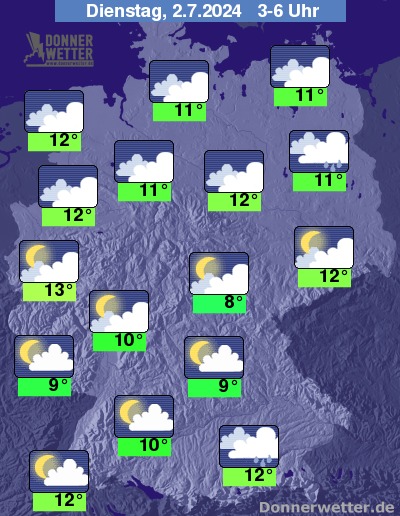 In der Nacht zum Dienstag sind vor allem in der Nordhälfte sowie südlich der Donau noch schauerartige Regenfälle und lokale Gewitter möglich. In den übrigen Landesteilen bleibt es bei meist auflockernder Bewölkung niederschlagsfrei.
