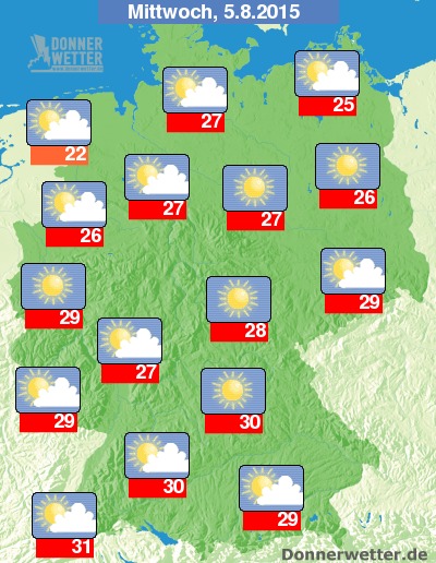 Heute sind im Süden und Osten anfangs noch gebietsweise dichte Wolken möglich, die aber kaum mehr Regen bringen, sonst zeigt sich der Himmel über Deutschland jedoch verbreitet locker bewölkt oder sogar wolkenfrei und es bleibt trocken. Die Temperatur steigt auf 22 Grad an der Nordsee und bis 31 Grad im Oberrheingraben.