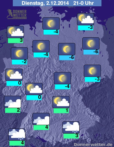 Am Abend bleibt es im Süden überwiegend bedeckt und es fällt gelegentlich weiterer Regen, sonst ist es hingegen meist sternenklar oder es ziehen nur lockere Wolken vorbei. Dabei bleibt es trocken. Die Abendtemperatur liegt bei 4 Grad am Bodensee und etwa -6 Grad auf der Mecklenburger Seenplatte.