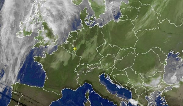Das aktuelle Satellitenbild zeigt ein Tief über den Britischen Inseln, welches mit warmer Luft nach Norden vorstößt. Über Deutschland sind lockere Wolkenfelder zu sehen.