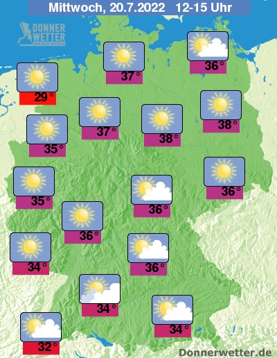 Heute Nachmittag scheint verbreitet die Sonne bei nur seltenen Wolken. Im Süden und Osten ziehen auch mal einige, meist nur lockere Wolkenfelder durch, dabei bleibt es trocken. Die Temperatur liegt bei 29 Grad an der Nordsee und sehr heißen 38 Grad in der Magdeburger Börde.