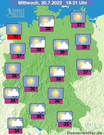 Heute Abend ist es über dem Bundesgebiet weiterhin meist heiter oder sonnig. Im Süden und Südwesten ziehen jedoch gebietsweise dichte Quellwolken auf und es können sich einzelne Schauer, örtlich auch Gewitter bilden. Im übrigen Land bleibt es trocken bei 30 Grad in Wilhelmshaven und 39 Grad in Berlin.