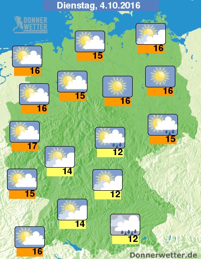 Am Montag, dem Tag der Deutschen Einheit zeigt sich das Wetter insgesamt sehr wechselhaft mit oft vielen, zeitweise dichten Wolken und dazu auch möglichen Schauern. Seltener sind auch Gewitter möglich. Es werden herbstliche 13 bis 17 Grad erreicht.