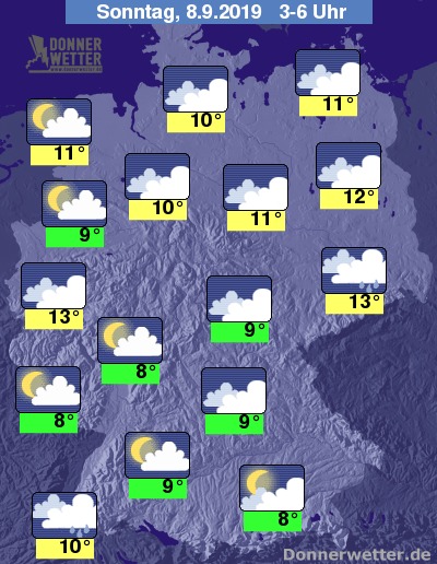 In der folgenden Nacht ist es über den westlichen Landesteilen häufig locker bis aufgelockert und nur hier und da stärker bewölkt, im übrigen Bundesgebiet bleibt die Wolkendecke meist verschlossen, es bilden sich jedoch nur vereinzelt einzelne Schauer. Die Temperatur sinkt auf 13 Grad in Köln und bis 8 Grad am Taunus.