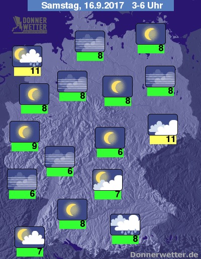 In der Nacht klart der Himmel über dem Land verbreitet auf. Ausnahme bleibt der Südosten der Republik, wo es die Nacht über meist bedeckt und regnerisch bleibt. Im Nordseeumfeld bringen dichte Wolken gebietsweise Schauer und auch mögliche Gewitter, sonst bleibt es aber trocken. Die Temperatur sinkt auf 11 Grad in Dresden und bis etwa 6 Grad am Taunus.