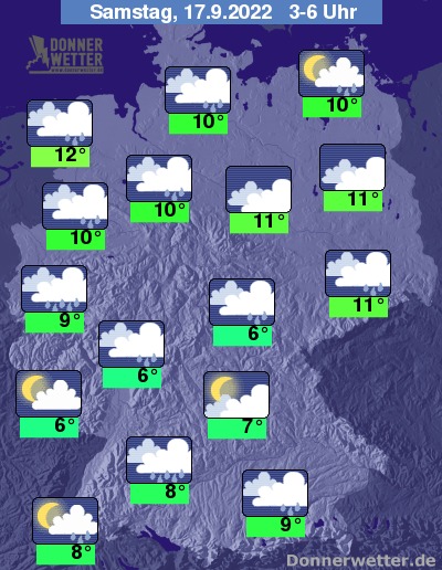 In der Nacht zum Samstag ist der Himmel über dem Süden und über Vorpommern häufig locker bis aufgelockert bewölkt, sonst ziehen jedoch verbreitet dichte Wolken durch und es bilden sich gebietsweise Schauer. Im Ostseeumfeld entwickeln sich örtliche Gewitter. Die Tiefstwerte liegen bei 12 Grad in Emden und etwa 6 Grad in Erfurt. An der Nordsee weht ein stürmischer Wind.