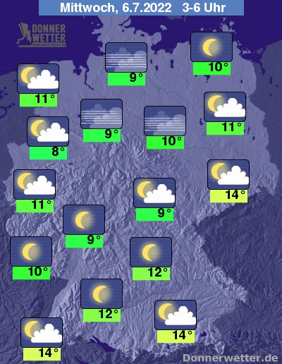 In der Nacht zum Mittwoch klingen letzte kurze Schauer an den Alpen rasch ab und es lockert auch hier immer weiter auf. Im übrigen Bundesgebiet ist es bereits verbreitet sternenklar oder nur locker bewölkt, dazu bleibt es trocken. Die Temperatur sinkt auf 14 Grad in München und 9 Grad in Hamburg.