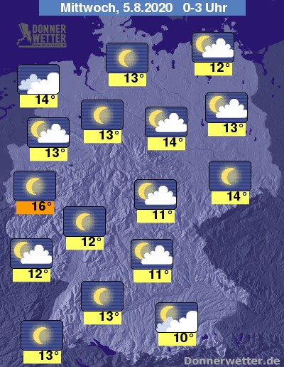 In der Nacht auf Mittwoch bestimmen Sterne oder nur lockere Wolken das Himmelsbild über weiten Teilen des Landes. Dichtere Wolken halten sich in den kommenden Stunden meist nur im Umfeld der Nordseeküste und an den Alpen. In den frühen Morgenstunden kann sich dann vor allem im Osten und Südosten stellenweise Nebel bilden. Schauer sind nicht zu erwarten.