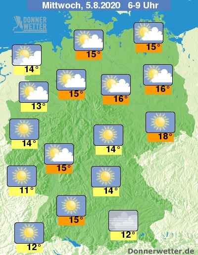 Die Wochenmitte startet im norddeutschen Tiefland heiter oder nur locker bewölkt, dichtere Wolken finden sich in den Frühstunden stellenweise im äußersten Nordwesten. Der Süden beginnt den Tag mit zumeist wolkenlosem Sonnenschein. Es bleibt trocken.