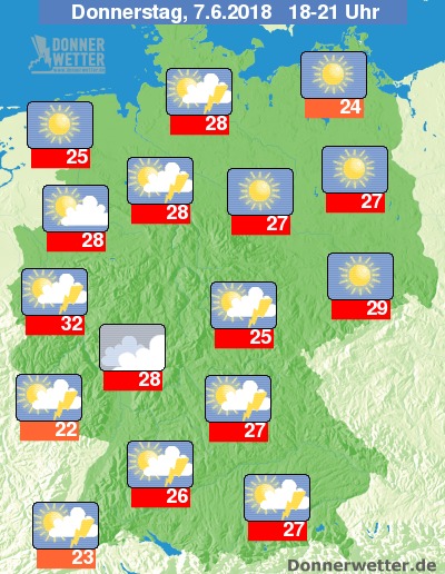 Die Gewitterneigung nimmt am Nachmittag und frühen Abend noch einmal zu und vor allem zwischen Niederrhein und Bayerischem Wald muss mit teils kräftigen Schauern und Gewittern mit Starkregen und Hagel gerechnet werden. Auch in anderen Landesteilen sind vereinzelte Gewitter zu erwarten, lediglich im Nordosten bleibt es überaus sonnig und trocken.