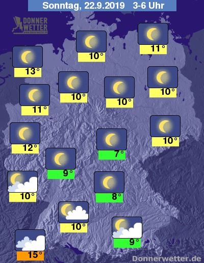 In der Nacht zum Sonntag zeigt sich der Himmel anfangs landesweit sternenklar. Im Laufe der Nacht ziehen dann besonders im Südwesten, bis zum Morgen auch im Süden und Westen einige, zum Teil dichte Wolken auf, dazu bleibt es aber trocken. Die Temperatur sinkt auf 15 Grad im Breisgau und bis 7 Grad im Eichsfeld.