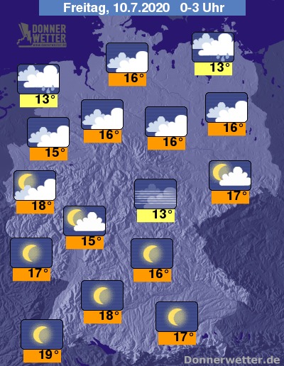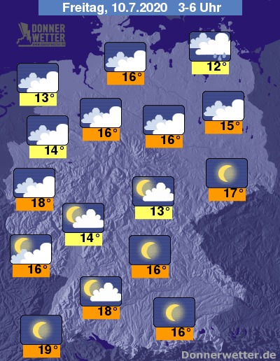 Bis zu den Frühstunden kühlt die Luft auf 12 Grad an den Küsten sowie in Schleswig Holstein und 19/18 Grad im Südwesten sowie in den Großstädten Westdeutschlands ab. Die Werte passen sich damit also wieder ein wenig an im Land.
