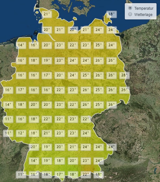 Hoch "Quinlan" zieht nun endgültig nach Osten ab und dahinter zieht das Regenband eines Island-Tiefs über Mitteleuropa hinweg. Dieses bringt teils kräftige Schauer und Gewitter mit sich, die im Tagesverlauf ostwärts über Deutschland hinwegziehen. Nach Abzug der Schauer und Gewitter ist der Himmel weiterhin meist dicht bewölkt und vereinzelt regnet es noch leicht. Im Nordosten des Landes bleibt es hingegen zunächst noch recht sonnig, bevor sich gegen Abend auch hier vermehrt Quellwolken bilden.