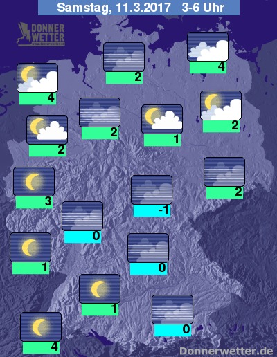 In der Nacht zum Samstag lockert und klart die Bewölkung auch im Norden, Osten und Südosten immer weiter auf. Im übrigen Bundesgebiet ist der Himmel zumeist sternenklar. Es bleibt landesweit trocken bei Tiefstwerten von 4 Grad in Emden und bis -1 Grad im Vogtland.