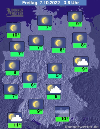 In der Nacht zum Freitag zeigt sich der Himmel über Deutschland weitgehend sternenklar, hier und da sind ein paar Wolken möglich. Es bleibt trocken bei Werten von 10 Grad in Cuxhaven und 5 Grad in Jena. An der See weht ein starker, teils auch stürmischer Wind.